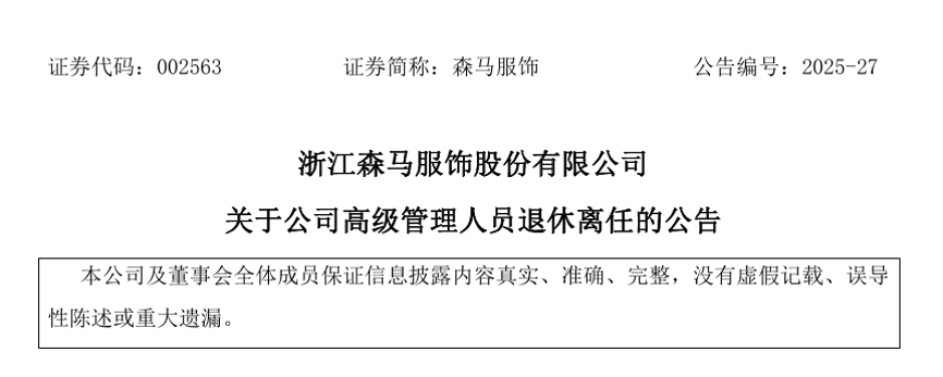 9月16日,森马服饰发布了一则高级管理人员退休离任的公告。