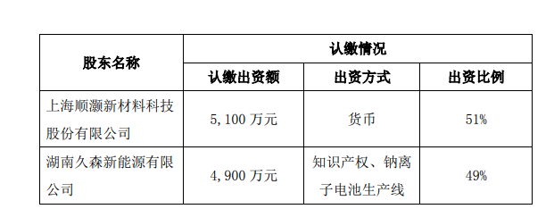 灏森钠电注册资本暂定为1亿元,其中顺灏股份以货币方式出资5100万元,占注册资本51%;久森新能源以知识产权、钠离子电池生产线的方式合计出资4900万元,占注册资本49%。