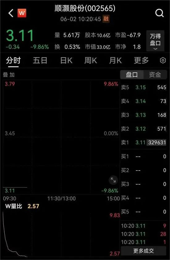 6月2日,顺灏股份一字跌停,截至收盘,报3.11元/股,封单金额超1亿元。