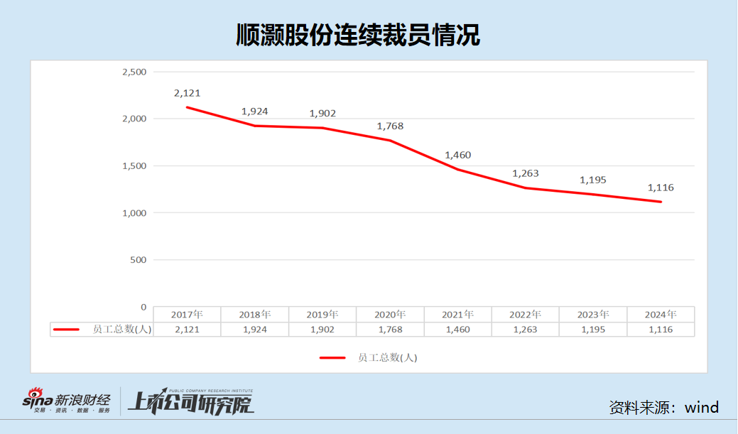 ¡¡¡¡windÊý¾ÝÏÔʾ£¬2017-2024Äê¸÷ÄêÄ©£¬Ë³å°¹É·ÝÔ±¹¤×ÜÊý·Ö±ðΪ2121ÈË¡¢1924ÈË¡¢1902ÈË¡¢1768ÈË¡¢1460ÈË¡¢1263ÈË¡¢1195ÈË¡¢1116ÈË¡£´Ó2018Ä꿪ʼ£¬¹«Ë¾Ã¿Äê¶¼ÔÚ²ÃÔ±¡£2024ÄêÄêÄ©£¬¹«Ë¾Ô±¹¤×ÜÊý½Ï2017ÄêÄêÄ©¼õÉÙ47.38%£¬½Ó½ü¡°ÑüÕ¶¡±¡£