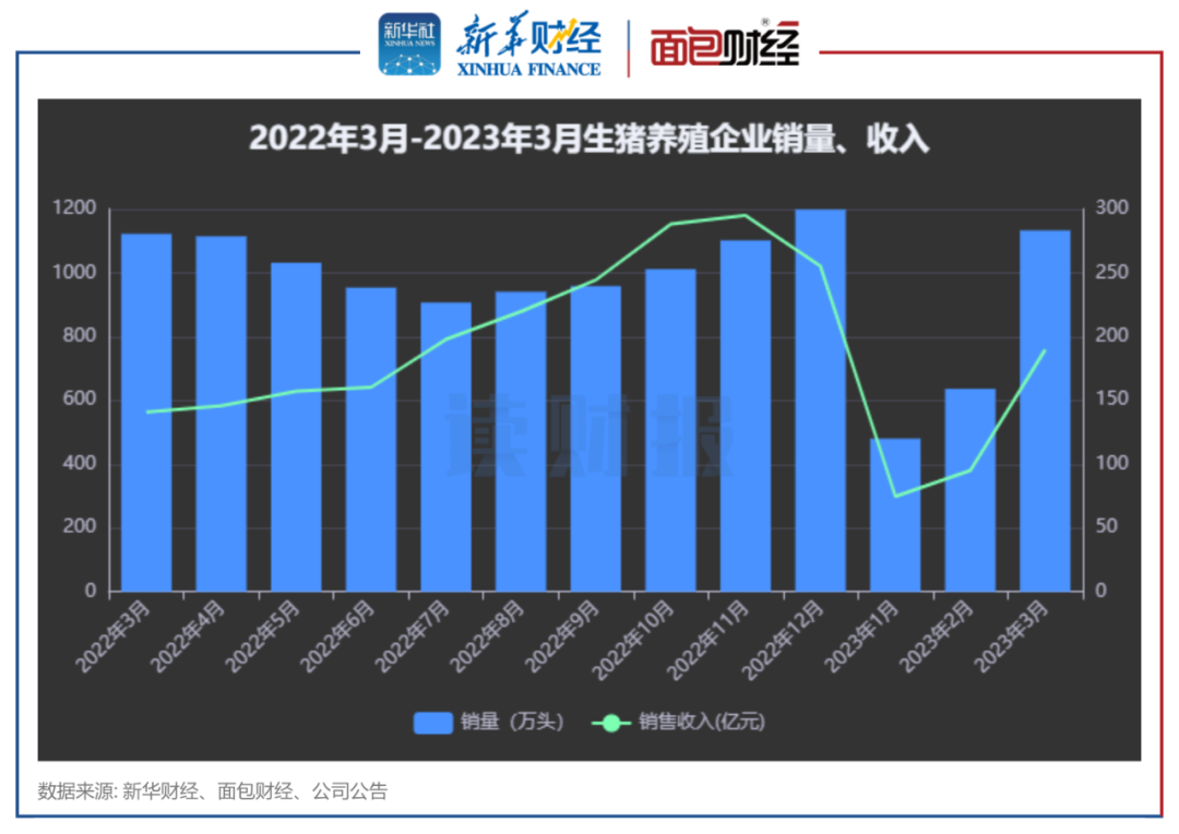 图2:2022年3月-2023年3月生猪养殖企业销量、收入