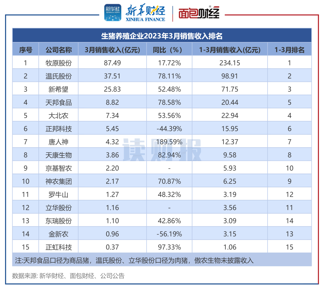 近期,生猪养殖企业2023年3月销售数据陆续披露。新华财经和面包财经研究员在剔除部分数据披露不全的上市企业后,以沪、深两大交易所主要上市生猪养殖企业为样本,分别统计其生猪销售收入、销量。