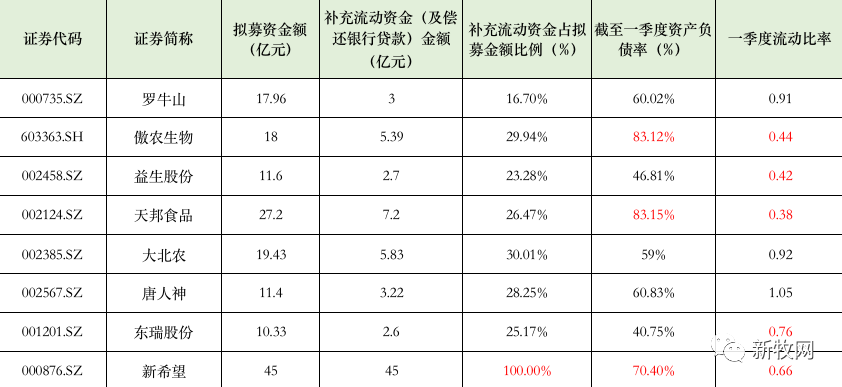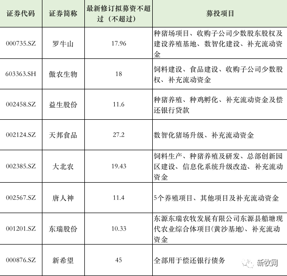 经时代财经统计,8家猪企均计划使用部分募集金额来减缓现金流压力,合计“补充弹药”75亿元。值得一提的是,新希望拟以募集的45亿元全部用来偿还银行债务。