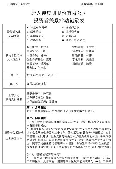 唐人神还向投资者介绍了公司目前资金情况。公司2024年度银行授信总额为140亿元,公司资信条件良好,融资渠道畅通。同时,公司持续加强资金流动性管理,在控制资产负债率适度水平基础上,加大股权融资和中长期债权融资力度,严格控制预付账款、强化应收账款回款、扩大供应链金融业务等,不断调整负债结构,实现资金效率提升,达成中长期债务占比处于行业较优水平,经营活动产生的现金流量净额为正且各季度持续向好,截止2023年三季度末,公司经营活动产生的现金流量净额为2.3亿元。