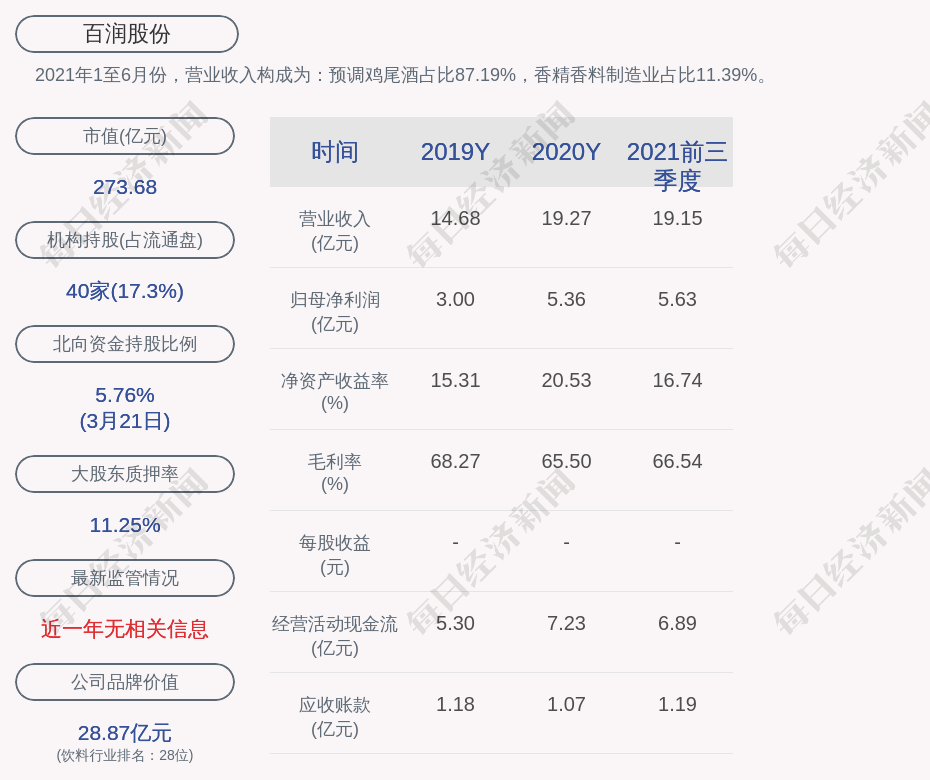 2021年1至6月份,百润股份的营业收入构成为:预调鸡尾酒占比87.19%,香精香料制造业占比11.39%。
