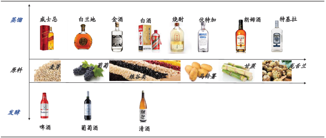 按照生产工艺及酿造材料粗略划分,世界有六大主流烈酒。酒精饮料的酿造工艺主要有蒸馏及发酵两大派别,原料则可分为麦芽、水果、粮谷等多种类别。目前烈酒基本以蒸馏工艺为核心,按酿造原料可粗略划分为六大品类:威士忌、白兰地、金酒、白酒、伏特加、朗姆酒。