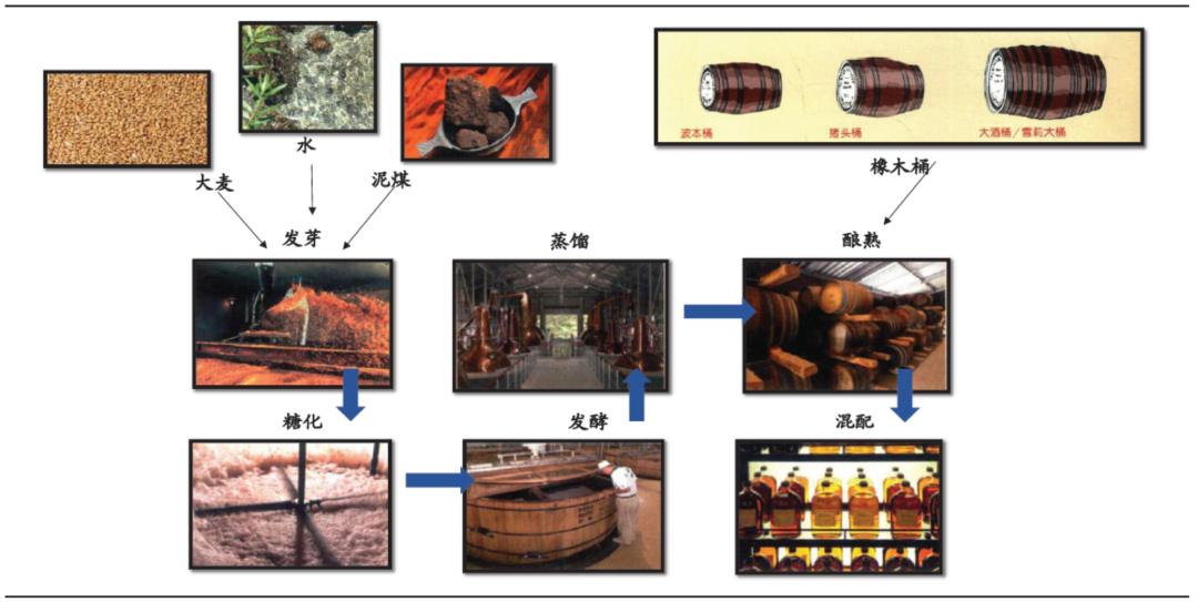 图表:威士忌的生产工艺流程:糖化、发酵、蒸馏、混配