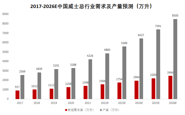 根据高禾投资研究中心预测数据,未来随着中国本土威士忌酒厂的逐步投建,至2026年中国威士忌的产量约为8,500万升,年复合增长率将达到15%,威士忌的表观需求量约为2,464万升,年复合增长率为12%。