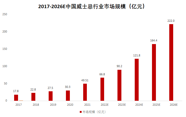 根据高禾投资研究中心预测数据,随着新一代消费者对于威士忌文化的接受和青睐,中国威士忌市场必将得到进一步发展,至2026年,中国威士忌市场规模约为222亿元,年复合增长率为35%。