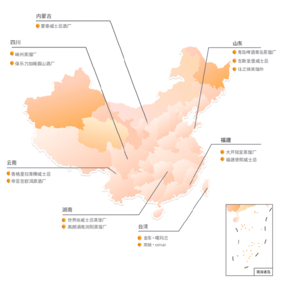 2021年11月2日,全球知名烈酒集团暨尊尼获加、苏格登威士忌等知名品牌的持有者帝亚吉欧(Diageo)宣布,其在中国的首家麦芽威士忌酒厂正式破土动工。帝亚吉欧洱源威士忌酒厂位于云南省洱源县,将生产其首批中国原产的单一麦芽威士忌。帝亚吉欧在洱源举行的奠基仪式上宣布了该投资5 亿人民币的项目细节。