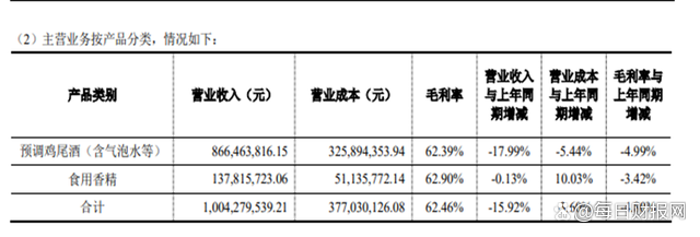 值得注意的是,在上半年百润股份预调鸡尾酒板块营收为8.66亿元,同比降低17.99%,净利润1.45亿元,同比降低更多,高达45.88%;毛利率62.39%,较上年同期下降了4.99个百分点;净利率16.74%,同比下降8.63个百分点。