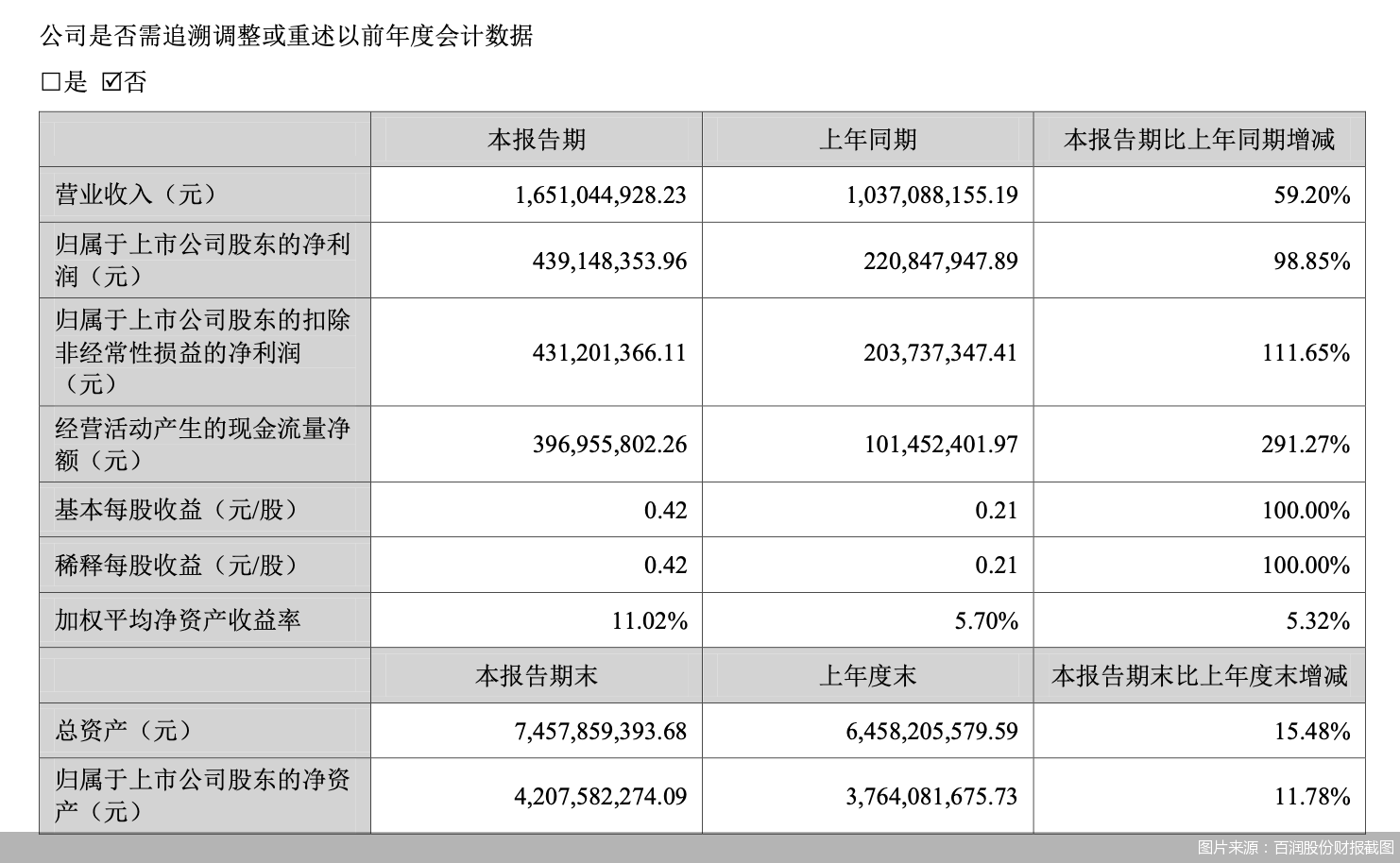 7月27日,上海百润投资控股集团股份有限公司(以下简称“百润股份”)(002568)发布《2023年半年度报告》显示,1-6月实现营业收入16.51亿元,同比提升59.2%;归属于上市公司股东的净利润为4.39亿元,同比提升98.85%;经营活动产生的现金流量净额为3.97亿元,同比提升291.27%。