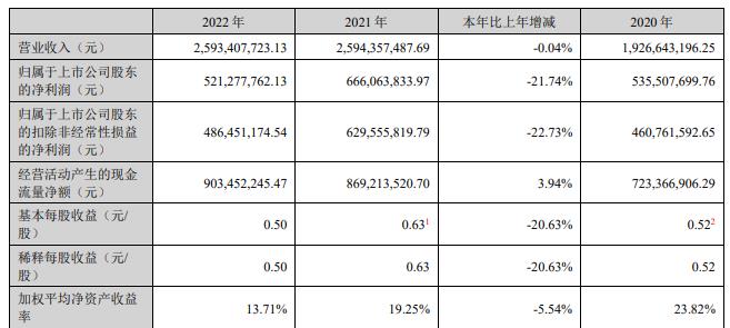 百润股份2022年年度报告显示,2022年,百润股份实现营业收入25.93亿元,同比下滑0.04%;归属于上市公司股东的净利润5.21亿元,同比下滑21.74%;归属于上市公司股东的扣除非经常性损益的净利润4.86亿元,同比下滑22.73%;经营活动产生的现金流量净额9.03亿元,同比增长3.94%。