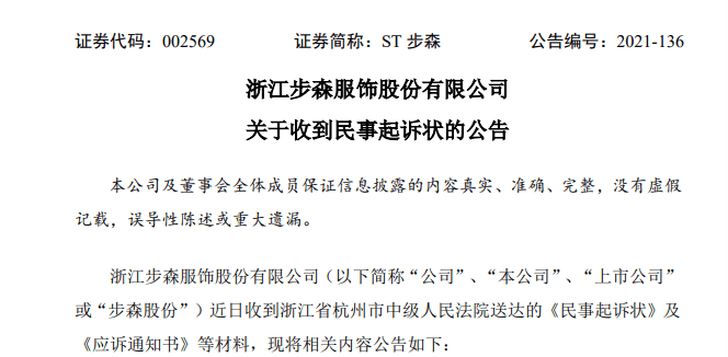 浙江步森服饰股份有限公司在2021年10月12日发布了《关于收到民事起诉状的公告》。公告内容显示,公司近日收到浙江省杭州市中级人民法院送达的《民事起诉状》及《应诉通知书》等材料。原告投资者诉求依法判决被告赔偿原告各项经济损失合计7099117.90元(其中:投资差额损失7084948.00元),佣金损失7084.95元,印花税损失7084.95元;并由被告公司承担诉讼费用。投资者索赔的事实和理由为2020年8月10日,步森股份发布《关于收到行政处罚决定书的公告》,称其收到中国证监会浙江证监局下发的《行政处罚决定书》((2020)7号)。经证监会查明,步森股份存在未按规定及时披露重大担保事项的行为。