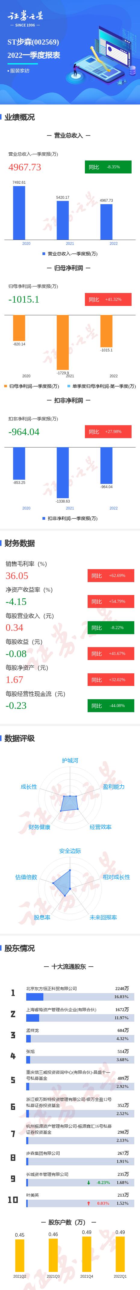 ST步森2022一季报显示,公司主营收入4967.73万元,同比下降8.35%;归母净利润-1015.11万元,同比上升41.32%;扣非净利润-964.05万元,同比上升27.98%;其中2022年第一季度,公司单季度主营收入4967.73万元,同比下降8.35%;单季度归母净利润-1015.11万元,同比上升41.32%;单季度扣非净利润-964.05万元,同比上升27.98%;负债率25.28%,财务费用48.98万元,毛利率36.05%。