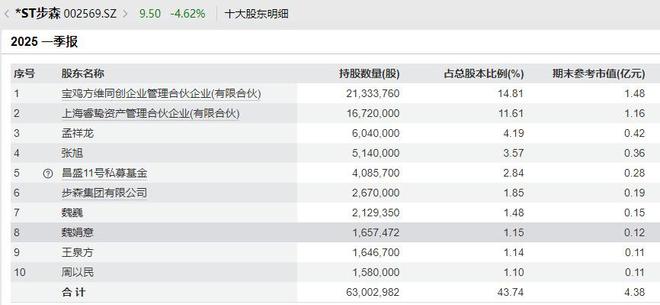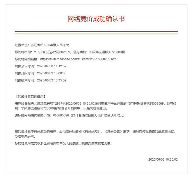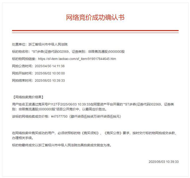 阿里拍卖网站还显示,拍品所有人为上海睿鸷资产管理合伙企业(有限合伙),即*ST步森二股东;依据法院执行裁定书,上述1672万股股票已被绍兴市中级人民法院冻结。对照*ST步森2025年一季报数据,股票过户后,王波、韩伟、张庆北将进入*ST步森前十大股东名单。