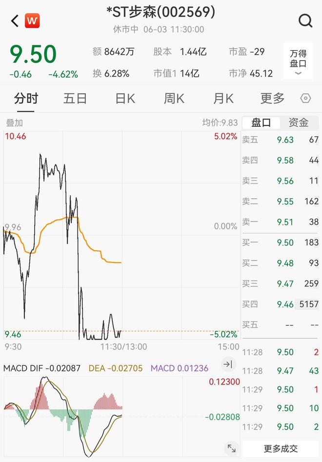 按此计算,*ST步森1672万股股票合计拍出1.59亿元,约9.50元/股。截至6月3日午盘,*ST步森跌4.62%报9.50元。