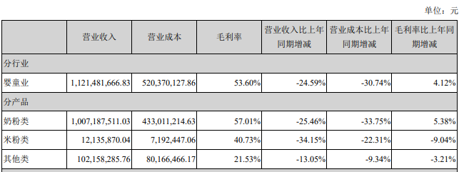 贝因美年中报告数据显示,上半年奶粉类产品营收约10.07亿元,同比下降25.46%,占总营收比重的89.81%。