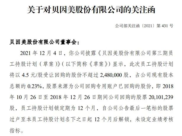 关注函称,2021年12月4日,公司披露《贝因美股份有限公司第三期员工持股计划(草案)》显示,此次员工持股计划将以4.5元/股受让回购的股份不超过2480000股,占公司现有股本总额的0.23%。