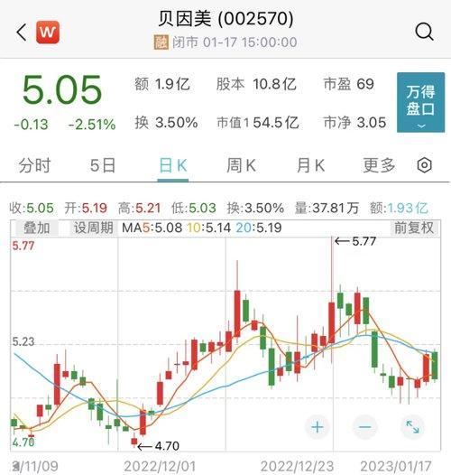 今日盘中,贝因美股价一度跌近3%。截至收盘,股价跌2.51%,报5.05元/股,市值54.5亿元。作为“奶粉第一股”,贝因美股价从2015年高点以来一路下滑,累计跌幅近80%。