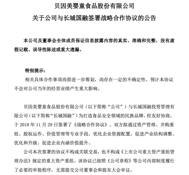 早在2018年11月29日,贝因美就与长城国融签署了《战略合作协议》,拟通过资产管理、并购重组、股权运作、价值管理等专业手段,优化企业资源配置,促进产业结构调整、优化和升级,促进企业内涵价值提升。