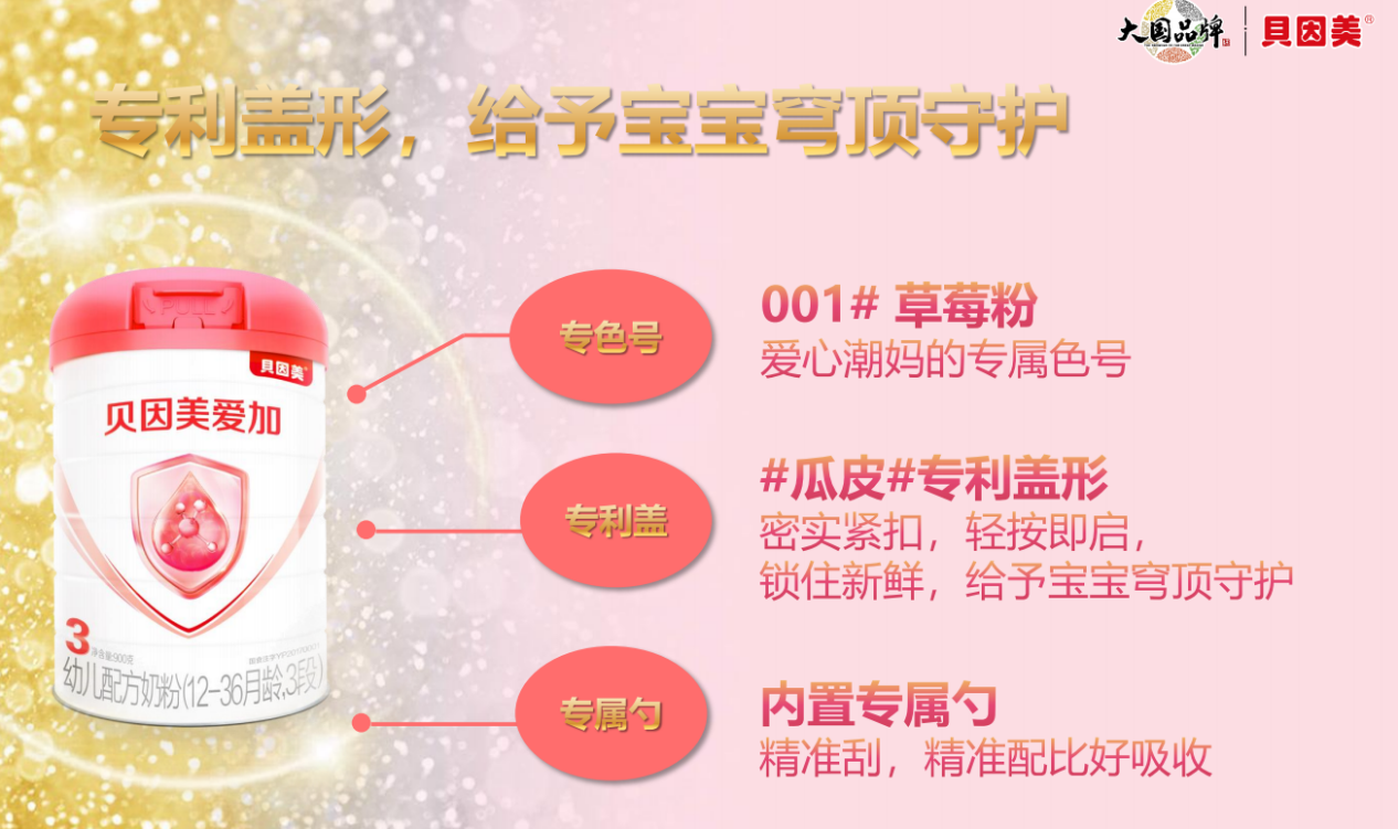 其次,贝因美爱加宝护盖还采用了十分贴心的盖形设计:专利盖就像穹顶一样能给予奶粉可靠的守护,不仅密实紧扣,而且只要轻轻一按就可开启。同时奶粉罐内部还置有专属勺,可以精准刮取宝宝每餐所需的奶粉量。贝因美爱加宝护盖的盖形设计能够牢牢锁住奶粉的新鲜和卫生,让宝宝吃的更健康。有了贝因美爱加宝护盖,“什么奶粉好”不再是一个让人难以回答的问题。
