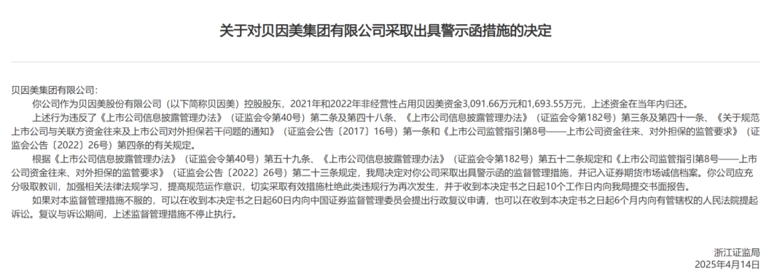 今年4月,证监局出具警示函,称控股股东2021年和2022年分别占用公司资金3,091.66万元和1,693.55万元,存在非经营性占用资金的情况(文件显示,资金已归还)。