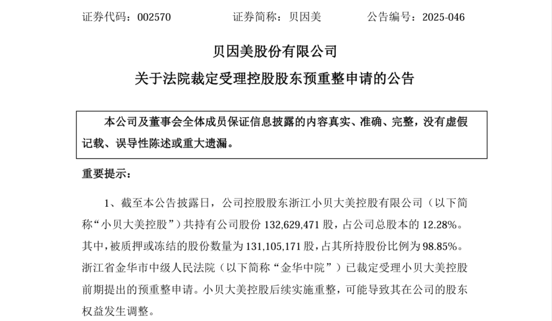 7月18日,贝因美宣布其股东小贝大美控股向金华市中级人民法院提出的预重整申请尚未被正式受理,小贝大美控股后续实施重整程序,可能导致其在公司的股东权益发生调整。
