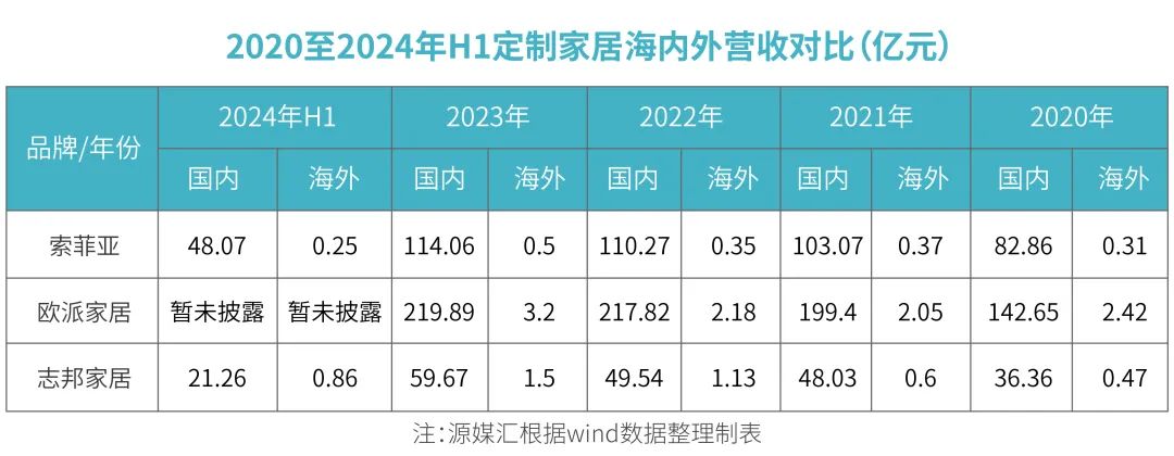 对比定制三巨头中的欧派家居和志邦家居,二者的海外营收分别从2020的2.42亿元、0.47亿元,上涨至2023年的3.2亿元、1.5亿元。均远高于索菲亚。