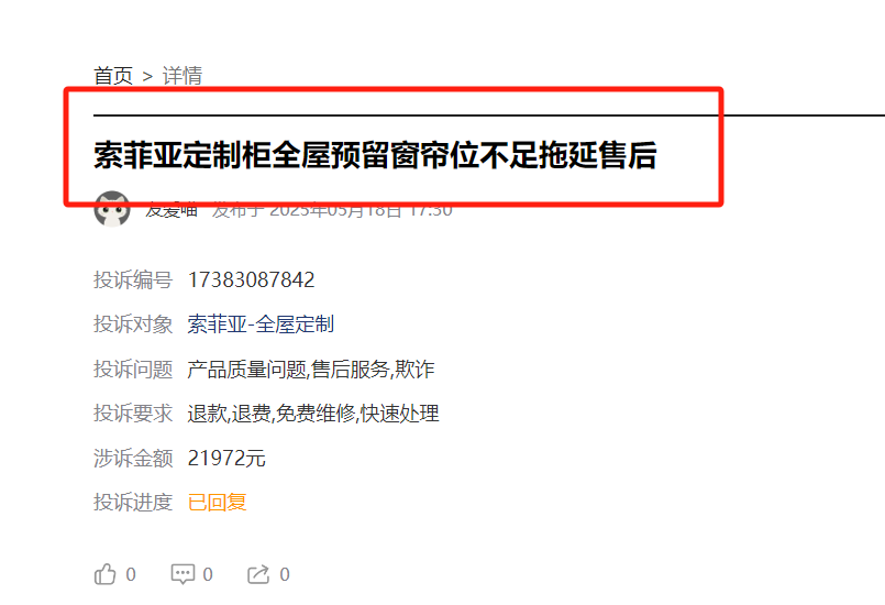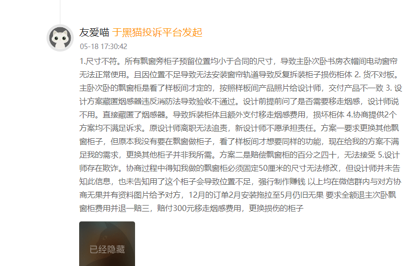 5月18日,有消费者投诉索菲亚定制柜全屋预留窗帘位不足。该消费者表示,所有飘窗旁柜子预留位置均小于合同尺寸,导致主卧、次卧、书房、衣帽间电动窗帘无法正常使用。货不对板,主卧、次卧飘窗柜看了样板间才定的,按照样板间产品照片给设计师,交付产品不一致;设计方案藏匿烟感器违反消防法导致验收不通过。