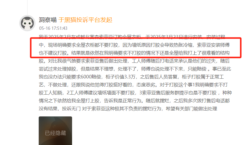 5月16日,还有消费者投诉称,其于2025年2月在成都北富森索菲亚订购全屋衣柜,于2025年3月23日进行安装,安装过程中,在其明确要求不打胶的情况下,全屋给打上了结构胶。