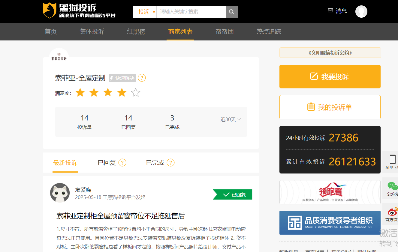 乐居财经李兰 5月20日,据黑猫投诉平台,索菲亚-全屋定制近一个月新增14条投诉,已完成3条。