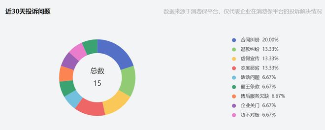 此外,根据平台信息,近一个月索菲亚新增15条投诉,问题集中于合同退款纠纷、虚假宣传、服务态度以及产品质量问题。对此,索菲亚需要加强其产品质量与服务管理。