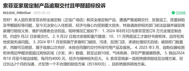 另一位消费者投诉称,索菲亚衣柜全屋定制产品逾期交付且存在质量问题,甲醛浓度远超其他区域,商家拒绝提供合理赔偿和解决方案,不过目前两起投诉均已显示完成。