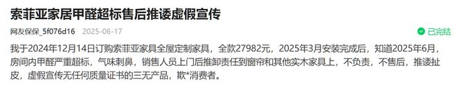 尽管索菲亚在品控端持续发力,但消费保平台显示,仍有消费者投诉其甲醛超标问题:一位消费者反映,其购买的索菲亚全屋定制家具安装后,房间内甲醛严重超标,销售人员推卸责任,不提供售后服务。