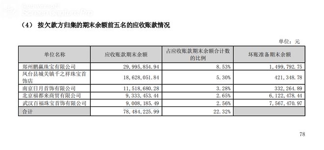 比如在其2022年上半年的前五大应收账款客户中,如北京福都来商贸有限公司、武汉百福珠宝首饰有限公司、凤台县城关镇千之祥珠宝首饰店均已被法院多次强制执行或已注销,但明牌珠宝并未将其应收账款坏账全部计提。