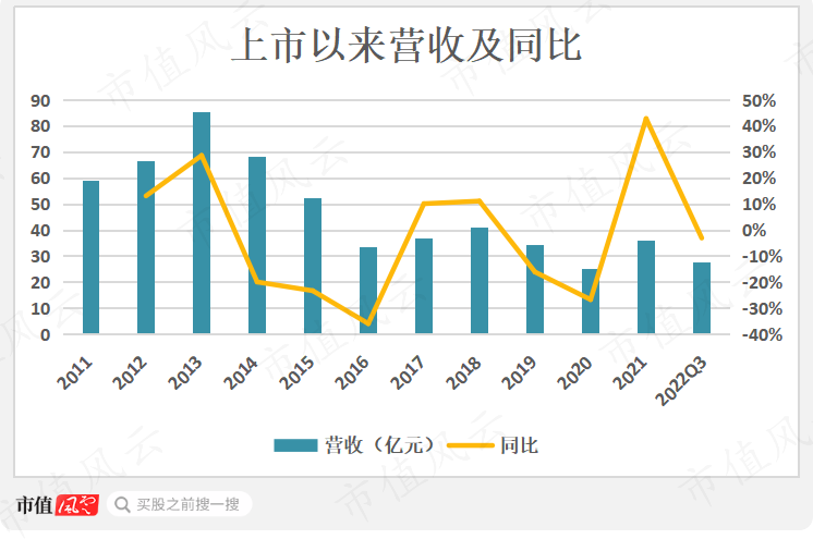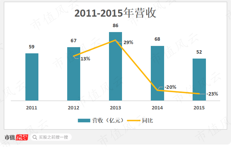 与之相对应的是,公司营收规模在2013年达到86亿,是有史以来的巅峰之时,随后便是连续两年超20%的下滑。