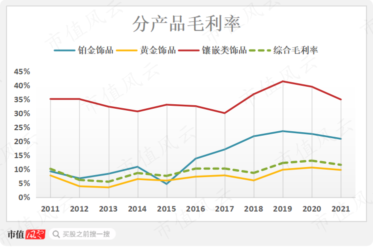 在近些年金价上涨的基础上,公司黄金饰品毛利率小幅改善,2021年近10%,同期公司综合毛利率12%。