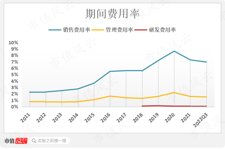 明牌珠宝销售费用率自2015年起便整体上升,最新达到7%,尤其是在公司规模增长有限的大背景下,这一费用蚕食了大部分营业利润。