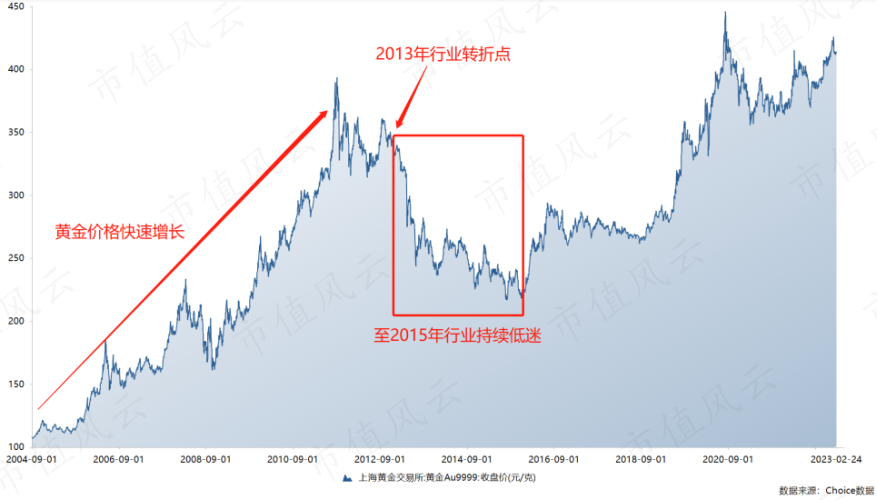 2013-2015年期间,金价连续下跌、投资需求疲弱,黄金珠宝行业持续低迷。