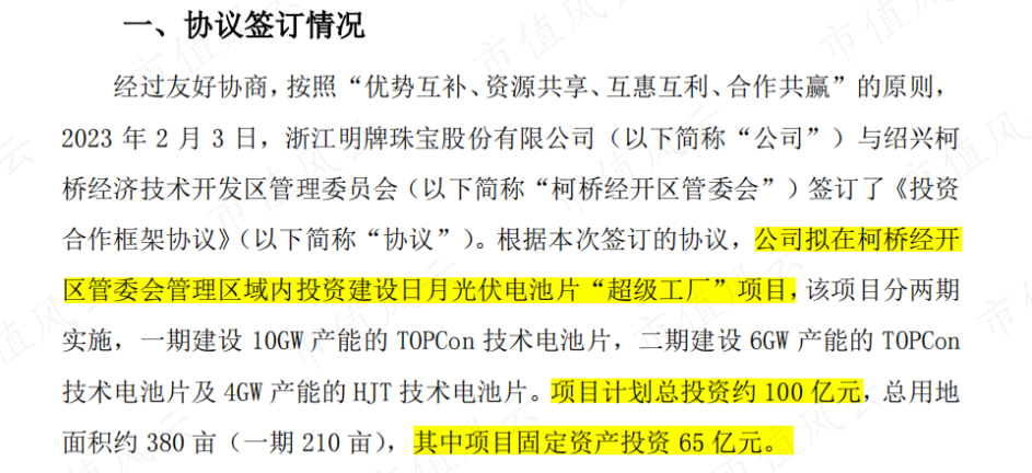 2月3日晚间,明牌珠宝平地一声雷,库嚓一下,撇出一份百亿跨界光伏电池片的公告。