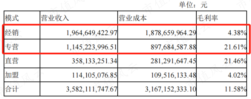 销售模式以经销和专营为主,合计占营收比重达87%。其中,经销是主要方式,但其毛利率(仅4%)远低于专营(22%)。