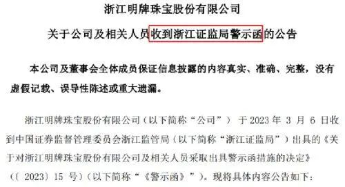 百亿跨界投资光伏电池片“超级工厂”的明牌珠宝,3月7日,明牌珠宝发布公告称,公司于2023年3月6日收到中国证券监督管理委员会浙江监管局(以下简称“浙江证监局”)出具的《关于对浙江明牌珠宝股份有限公司及相关人员采取出具警示函措施的决定》。