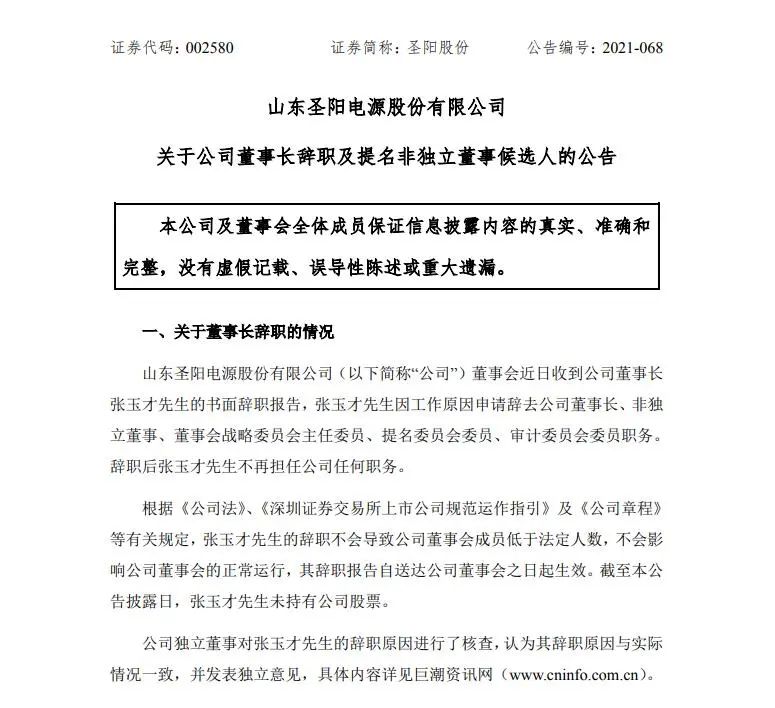 近日,山东圣阳电源股份有限公司(圣阳股份002580.SZ)公告称,公司董事长张玉才因工作原因申请辞去公司董事长、非独立董事、董事会战略委员会主任委员、提名委员会委员、审计委员会委员职务。辞职后张玉才不再担任公司任何职务。同时,经公司控股股东山东国惠投资控股集团有限公司提名、公司董事会提名委员会资格审核,同意提名李伟为公司第五届董事会非独立董事候选人。鲁网·泰山财经记者注意到,距离张玉才“官宣”出任圣阳股份,还不足一年。