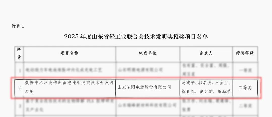 近日, 山东省轻工业联合会 正式印发《关于 2025 年度 山东省轻工业联合会 科学技术奖励的决定》,山东圣阳电源股份有限公司凭借“数据中心用高倍率蓄电池组关键技术开发与应用”项目,成功斩获 山东省轻工业联合会 技术发明奖二等奖,这是行业对公司在新能源储能领域技术创新与产业化成果的高度认可。