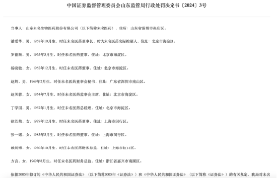 8月6日电,中国证券监督管理委员会山东监管局(以下简称“山东证监局”)发布了一则行政处罚决定书(〔2024〕3号),对山东未名生物医药股份有限公司(以下简称“未名医药(维权)”)及其多名高管在信息披露方面的违法违规行为进行了严肃处理。
