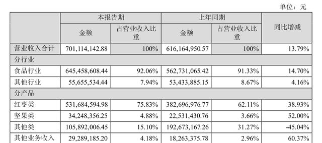 半年报显示,好想你主要专注于红枣和健康锁鲜食品的研发、生产、销售,旗下拥有枣博士、健康情、红小派、清菲菲、豆菲菲等食品产品。