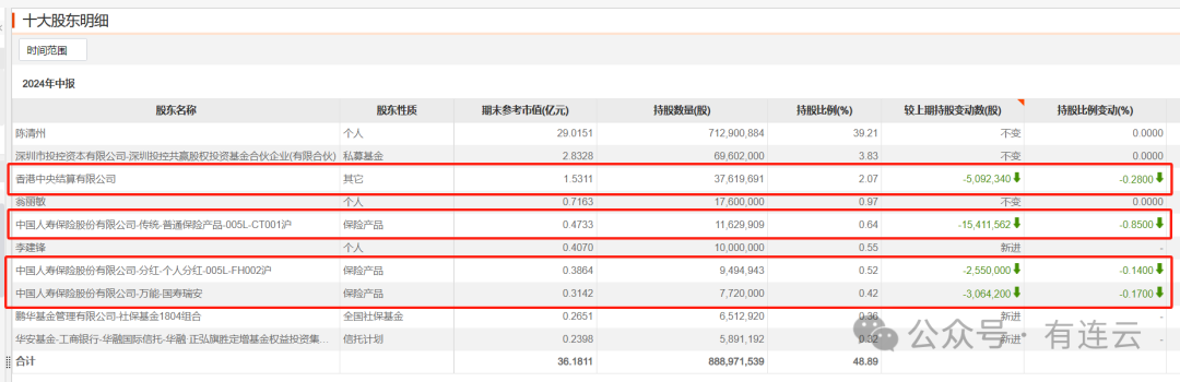 前十大股东中的“北向资金”,即香港中央结算有限公司与唯三的险资产品集体减持,分别是中国人寿保险股份有限公司-传统-普通保险产品-005L-CT001沪、中国人寿保险股份有限公司-分红-个人分红-005L-FH002沪、中国人寿保险股份有限公司-万能-国寿瑞安。经测算,减持总股数超2600万股。