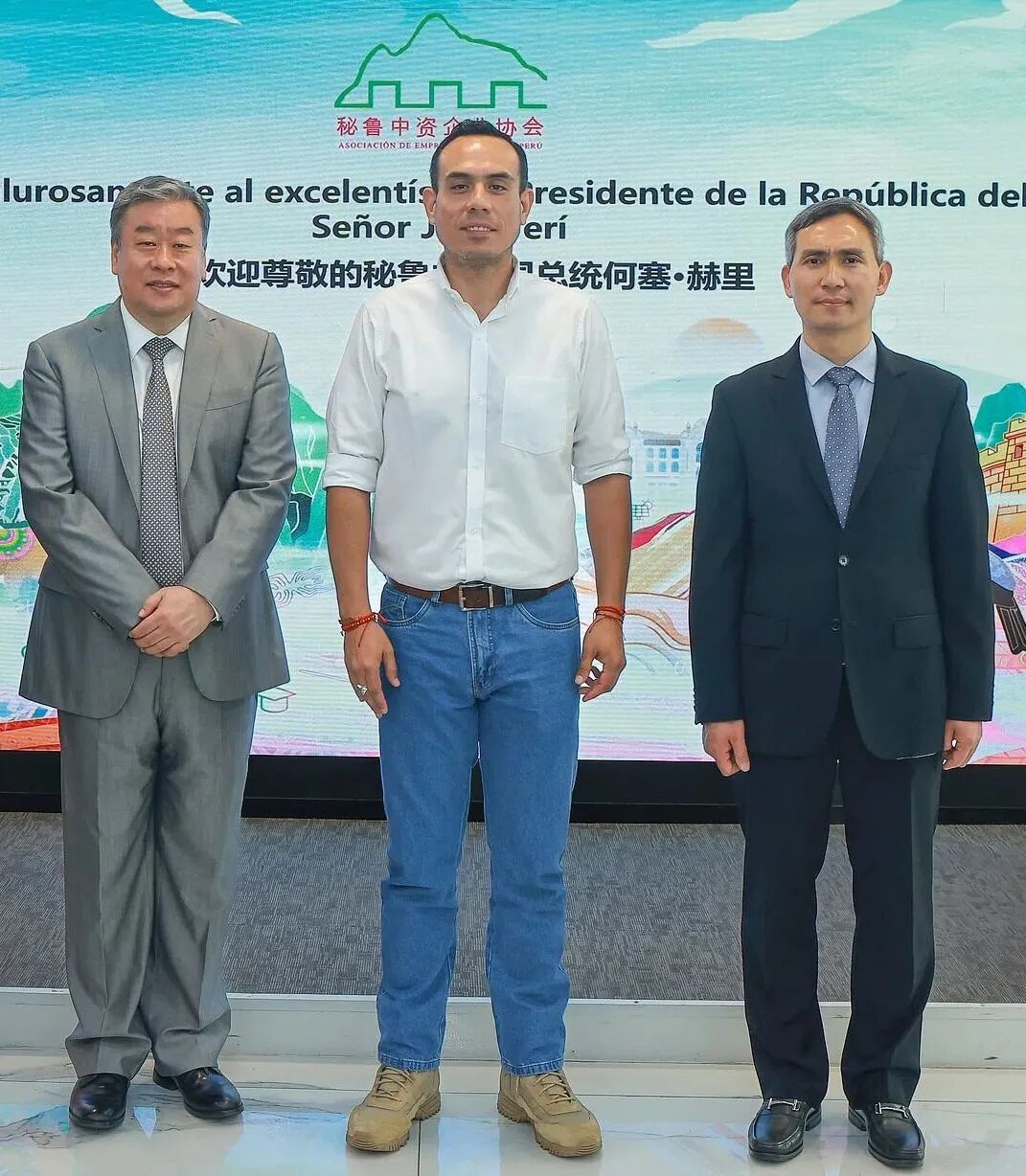 秘鲁总统何塞·赫里(中)、宋扬大使(左一),图片来源:秘鲁总统府社媒主页