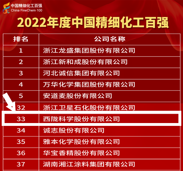 1月11日,第二十二届全国精细化工原料及中间体行业峰会暨2022中国精细化工百强发布会在江苏无锡开幕,会上发布了“2022年度中国精细化工百强”榜单。西陇科学股份有限公司再度入选,位列榜单的第33名。
